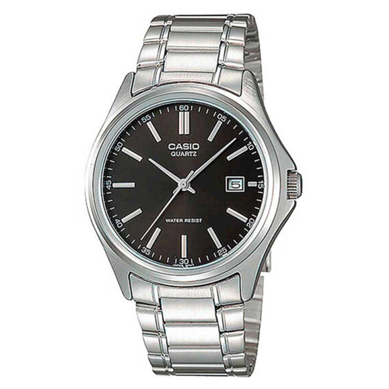 Analog watch with date display, a black face dial, silver dial hands and dial numerals, stainless steel band with a fold over clasp. This watch is water resistant and can only take splashes, made by Casio.