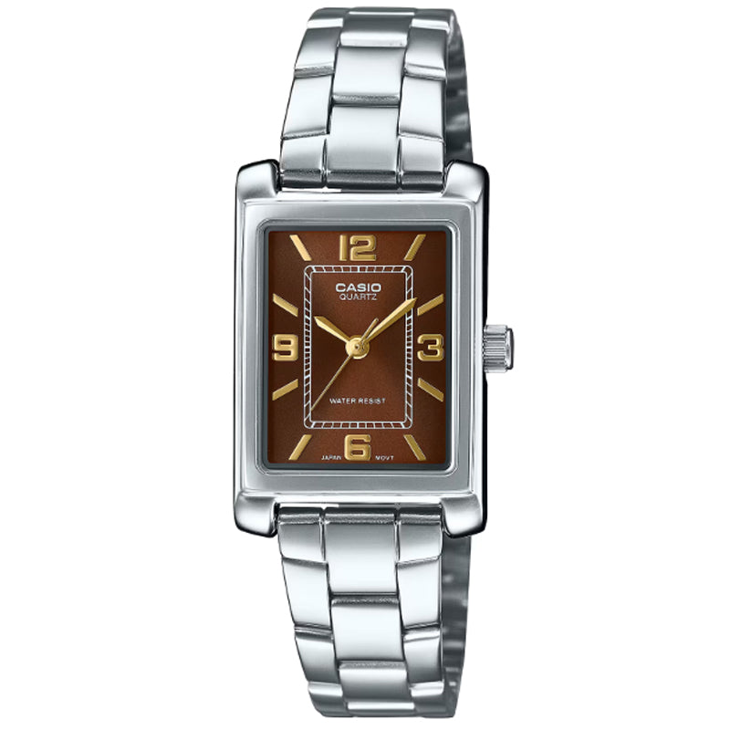 Analog watch with a brown face dial, gold dial hands and dial numerals, stainless steel band & fold over clasp. This watch is water resistant and can only take splashes, made by Casio.