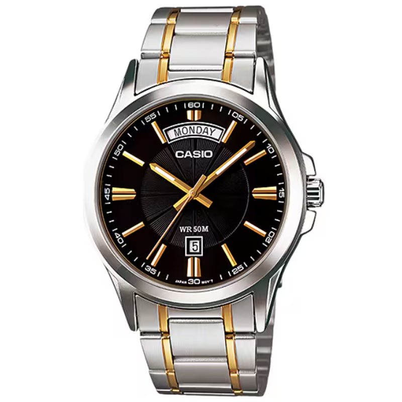 Analog watch with day & date display functionality, black face dial, luminous gold dial hands and dial numerals, two tone gold plated stainless steel band with fold over clasp. This watch has a water resistant mark of 5BAR which is suitable for showering with, made by Casio.