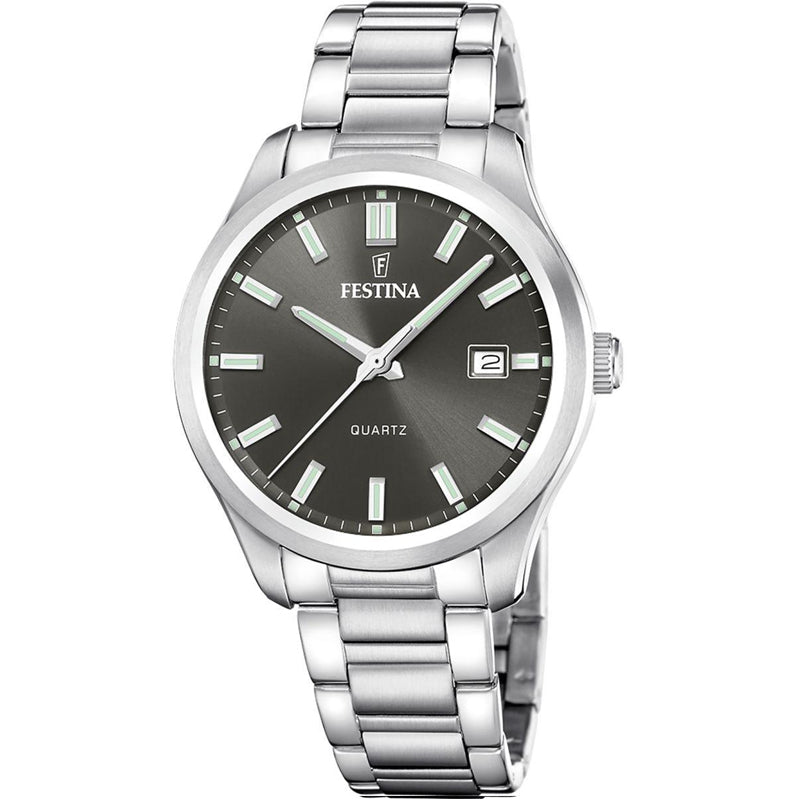 Analog watch with date display, black face dial, luminous silver dial hands and dial numerals, stainless steel band with a push deployment clasp. This watch has a water resistant mark of 5BAR which is suitable for showering with, made by Festina.