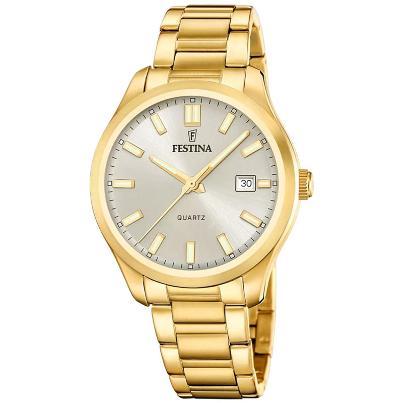 Analog watch with date display, silver face dial, luminous gold dial hands and dial numerals, gold plated stainless steel band with a push deployment clasp. This watch has a water resistant mark of 5BAR which is suitable for showering with, made by Festina.