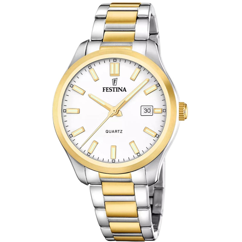 Analog watch with date display, white face dial, luminous gold dial hands and dial numerals, two tone gold plated stainless steel band with a push deployment clasp. This watch has a water resistant mark of 5BAR which is suitable for showering with, made by Festina.