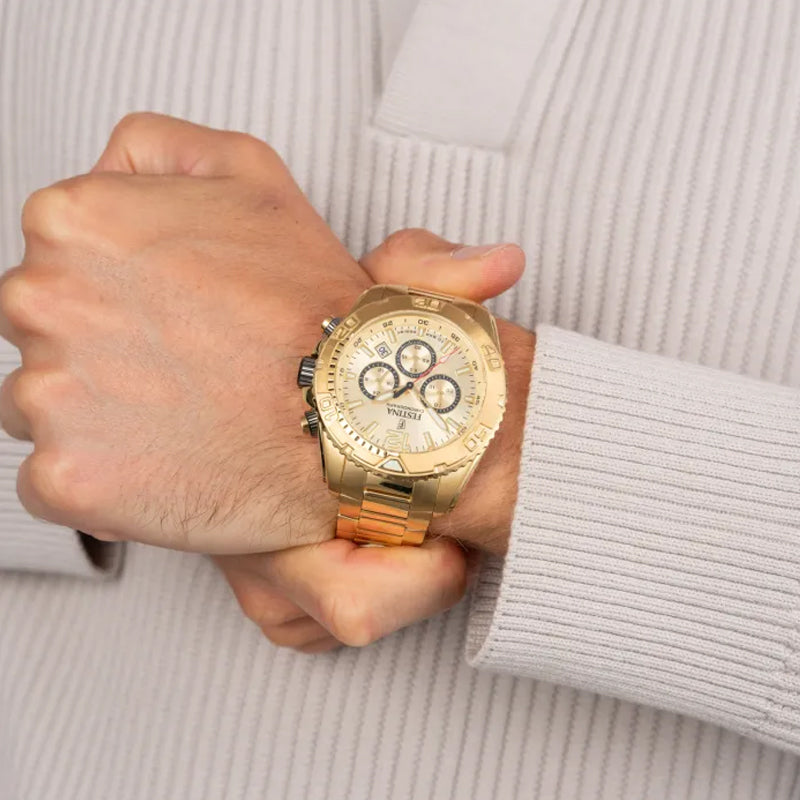 Chronograph watch with 60 seconds, 30 minutes and 12/24 hour sub dials, date display, gold face dial, luminous gold dial hands and dial numerals, gold plated stainless steel band with a push deployment clasp. This watch has a water resistant mark of 10BAR which is suitable for swimming with, made by Festina.