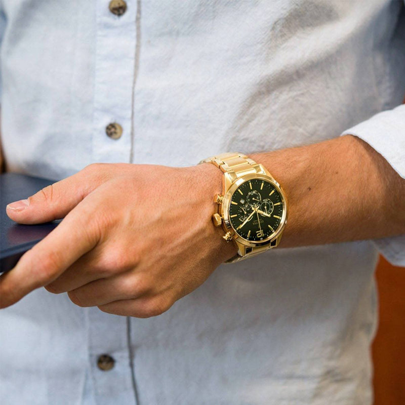 Chronograph watch with 60 seconds, 60 minutes and 12/24 hour sub dials, date display, green face dial, luminous gold dial hands and dial numerals, gold plated stainless steel band with a push deployment clasp. This watch has a water resistant mark of 5BAR which is suitable for showering with, made by Festina.