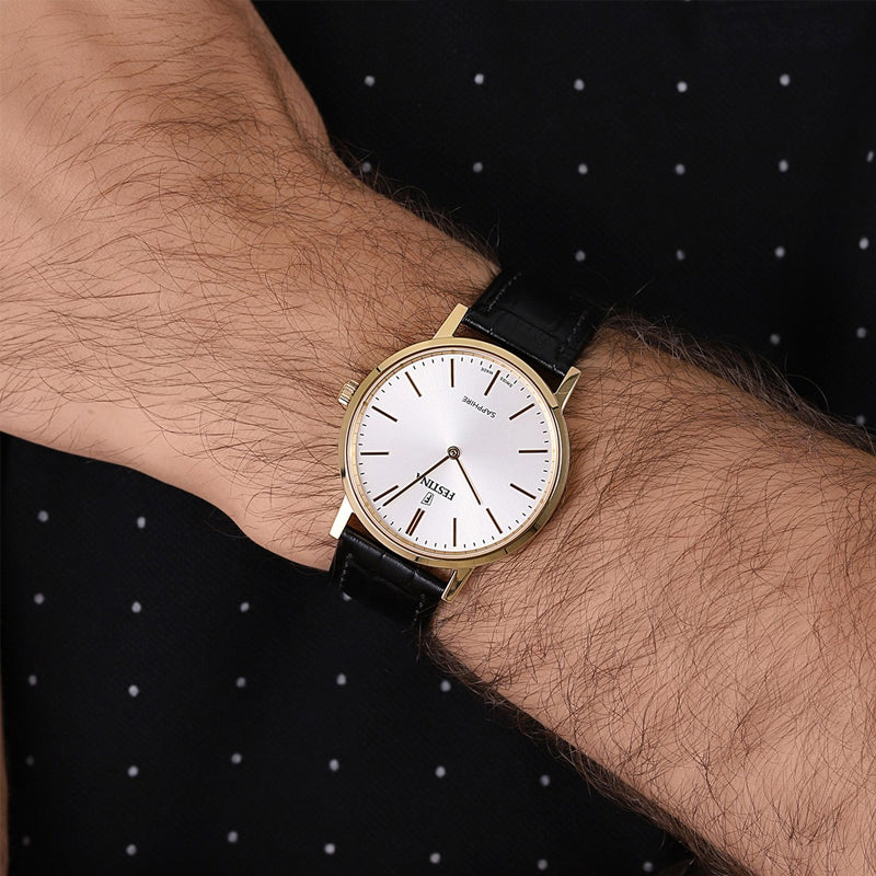 Analog watch with a silver face dial, black dial hands and roman dial numerals, black leather band with a buckle clasp. This watch has a water resistant mark of 5BAR which is suitable for showering with, made by Festina, part of the Swiss Made collection.
