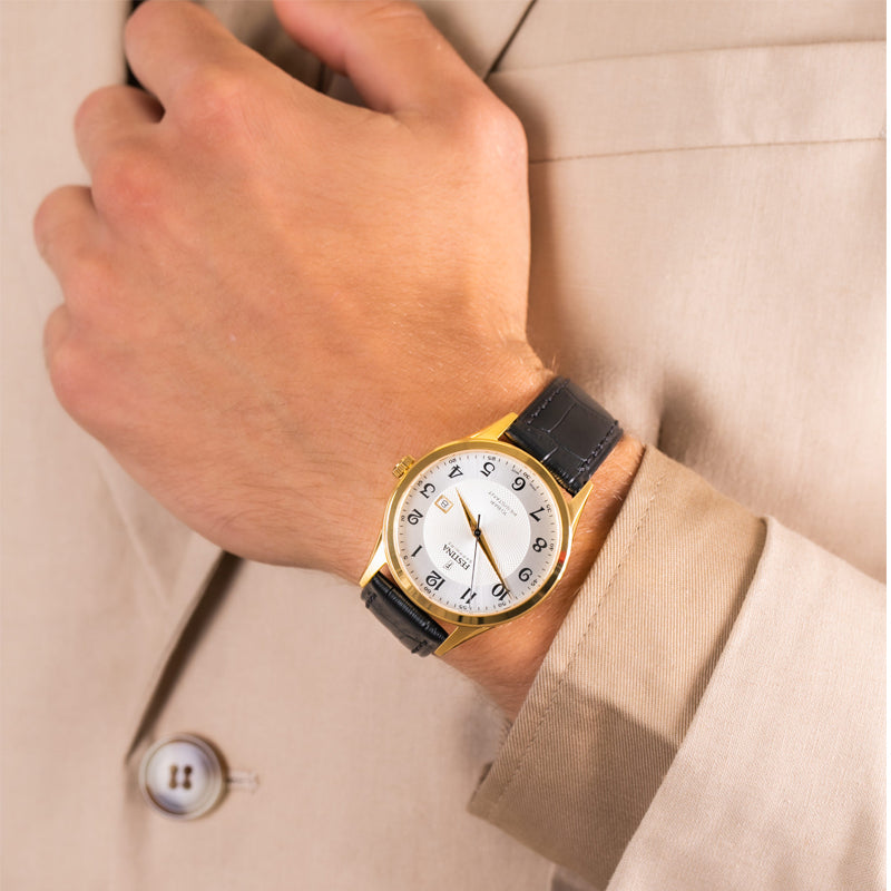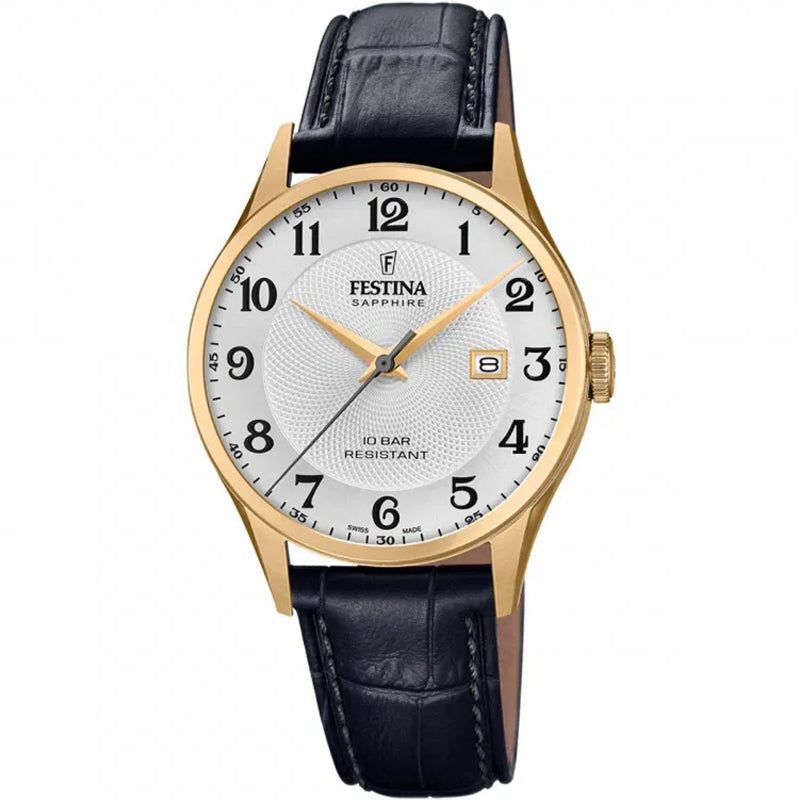 Analog watch with date display, textured silver face dial, gold dial hands and black dial numerals, black leather band with a buckle clasp. This watch has a water resistant mark of 10BAR which is suitable for showering with, made by Festina, part of the Swiss Made collection.