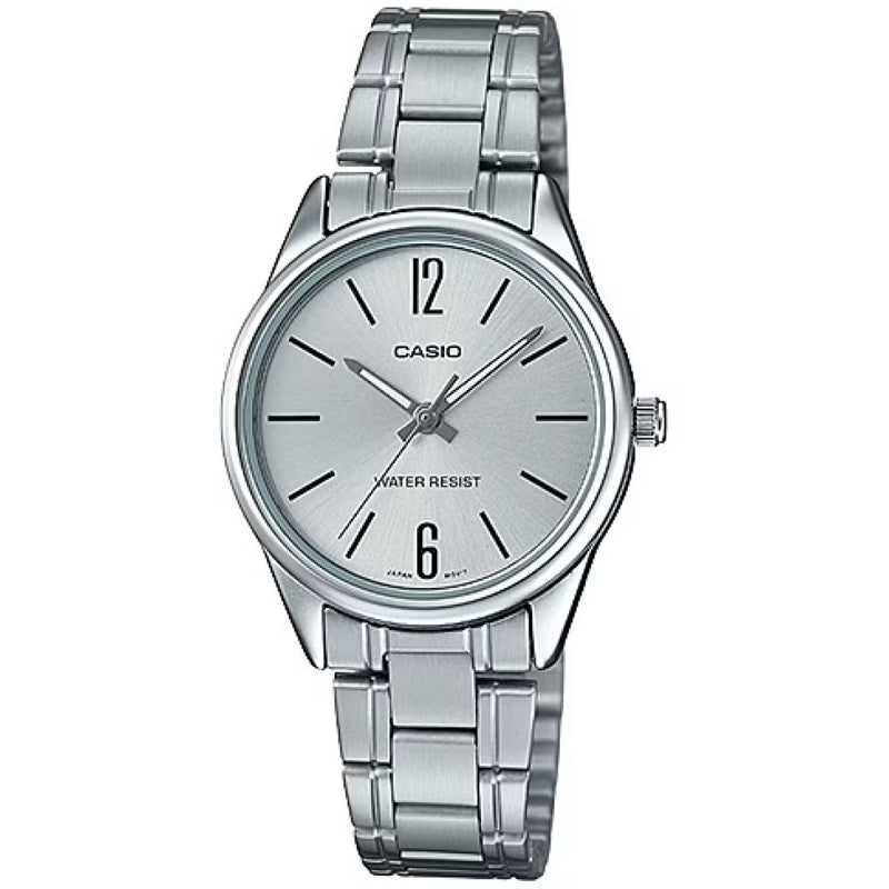 Analog watch with a silver face dial, luminous silver dial hands and black dial numerals, stainless steel band with a fold over clasp. This watch is water resistant and can only take splashes, made by Casio.
