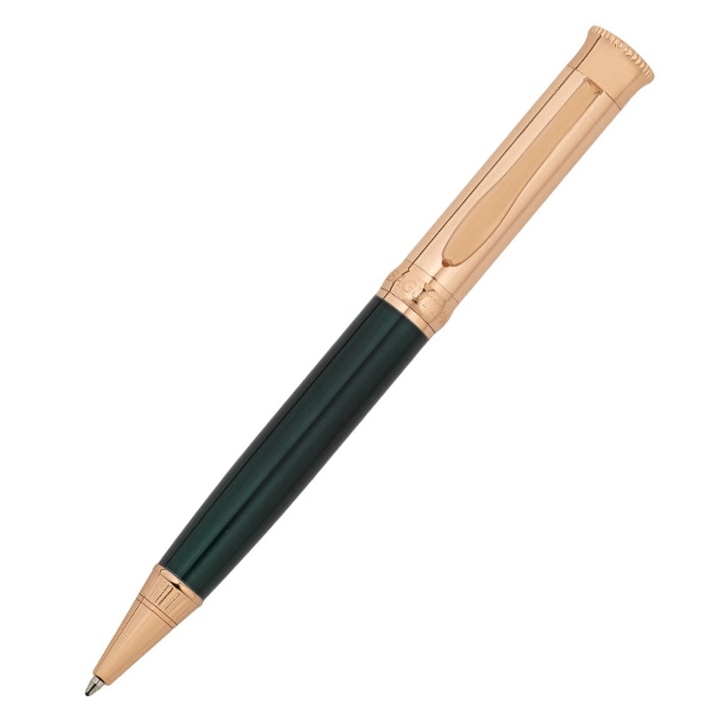 Ballpoint pen with a glossy green and polished rose gold body. Its other features are a blue ink refill & twist to open functionality. Made by Bagutta.