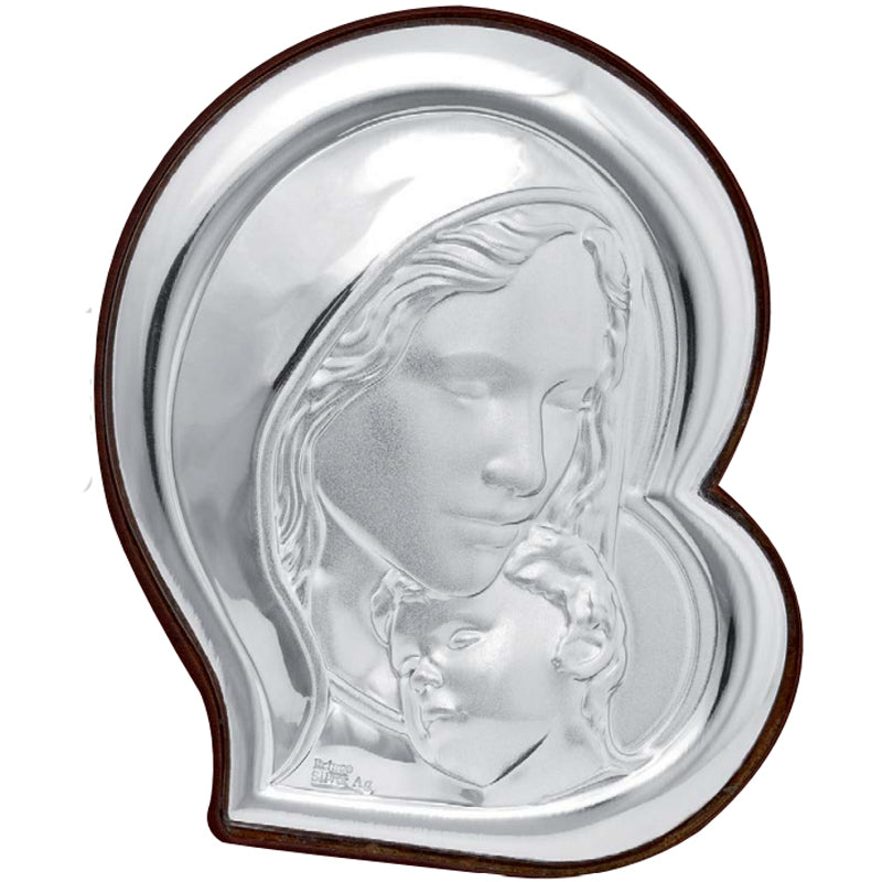 Roman Catholic icon with a laminated silver “Mother & Child” picture, which is attached to a textured brown wood frame.