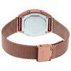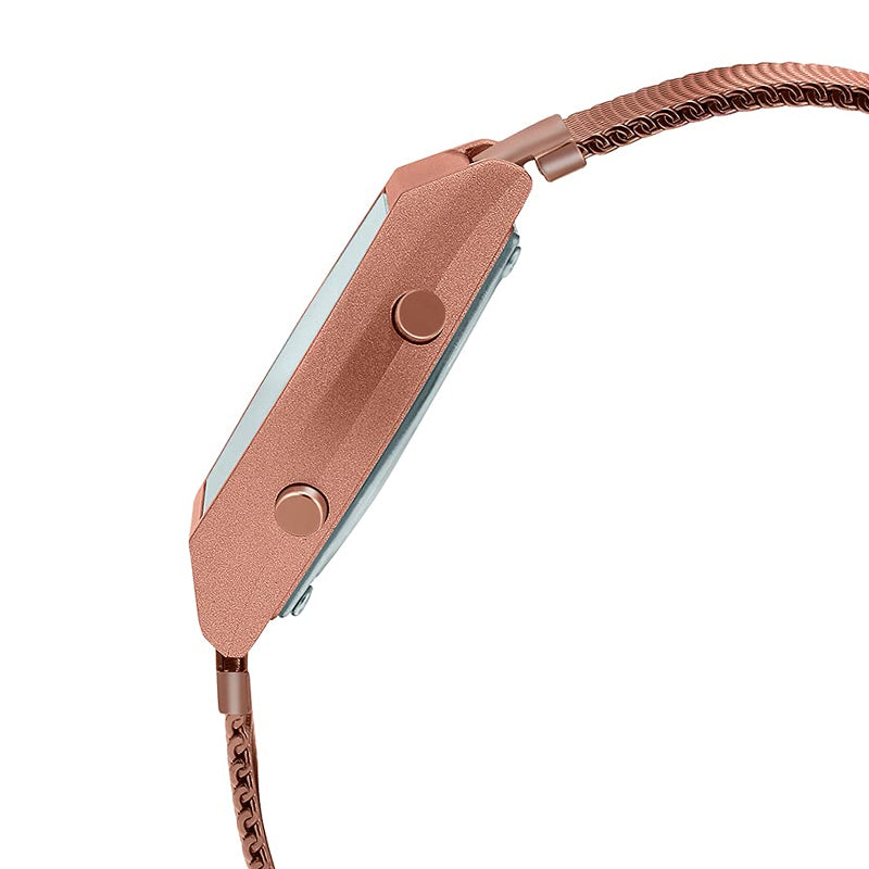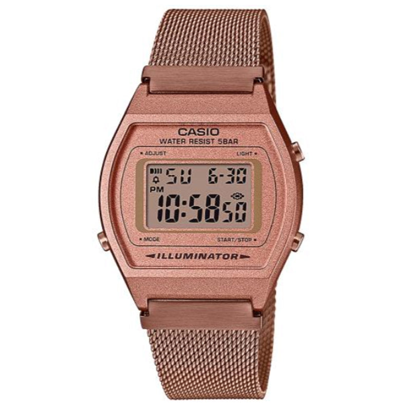 Digital watch with LED light, stopwatch, daily alarm, countdown timer, 12/24 hour format & automatic calendar functionalities. This watch has a rose gold plated stainless steel band with a fold over clasp. This watch is water resistant and can only take splashes, made by Casio.