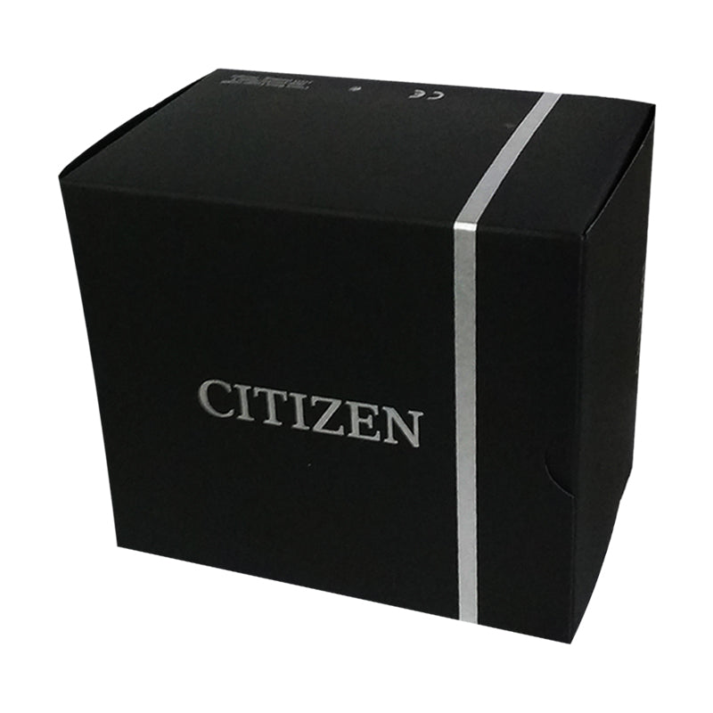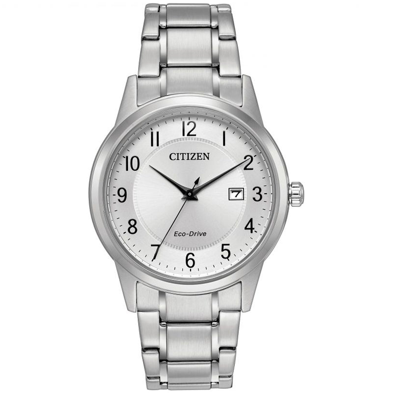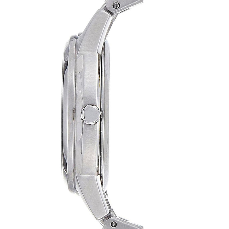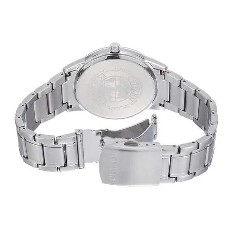Analog watch with date display functionality, black dial hands, silver face dial, black dial numerals & stainless steel band with push deployment clasp. This watch is water resistant and can only take splashes, made by Citizen.