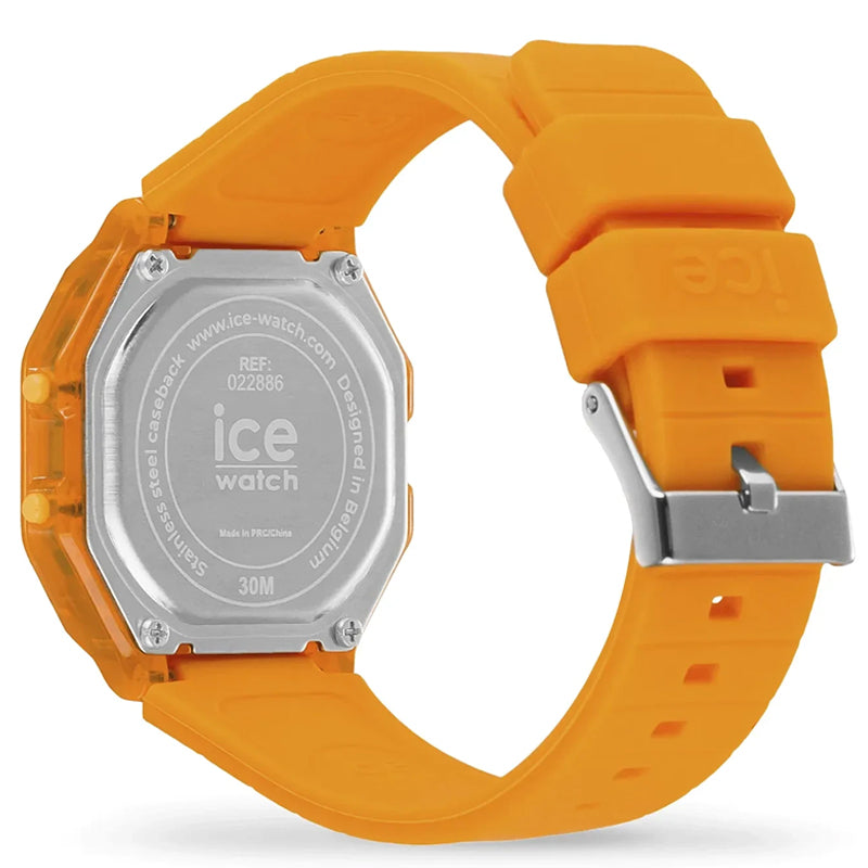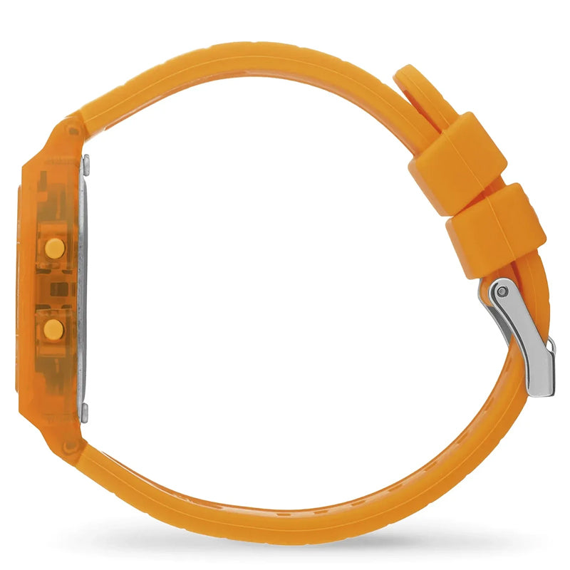 Digital watch with Dater, Stopwatch Lap time / Split time, Alarm clock, Time 12/24H format, Dual time, Backlight functionalities, an orange silicone strap with a buckle clasp. This watch is water resistant and can only take splashes, made by Ice, part of the Digit Retro collection.