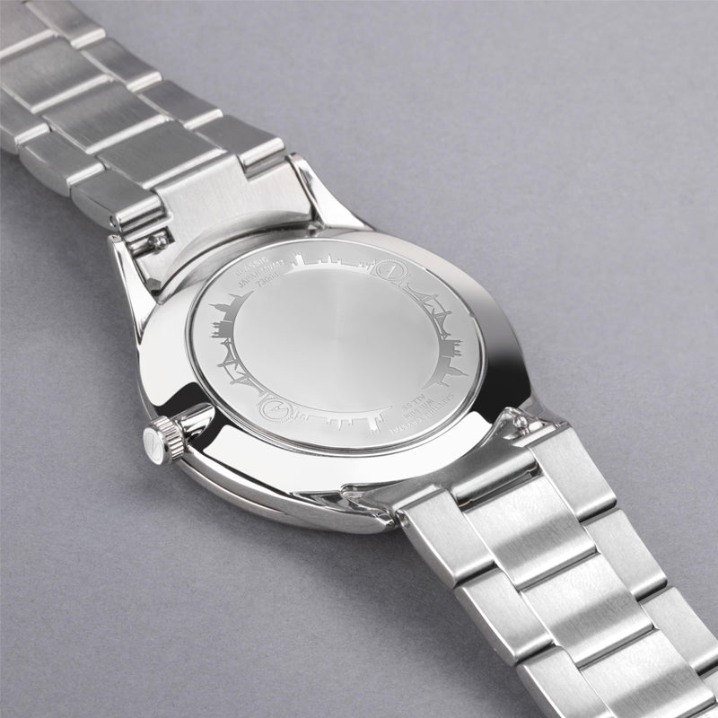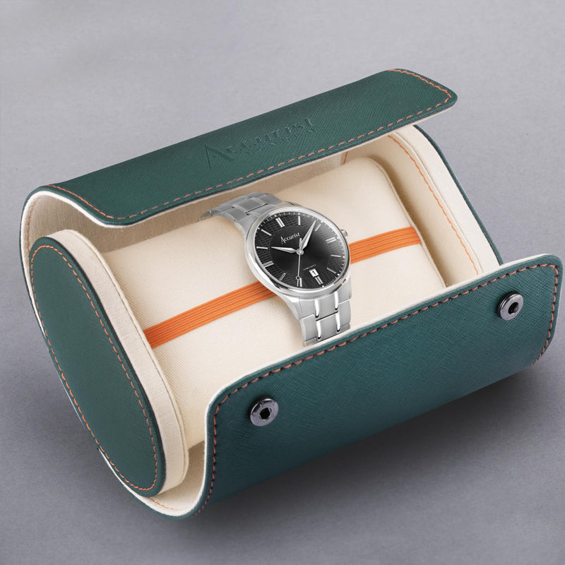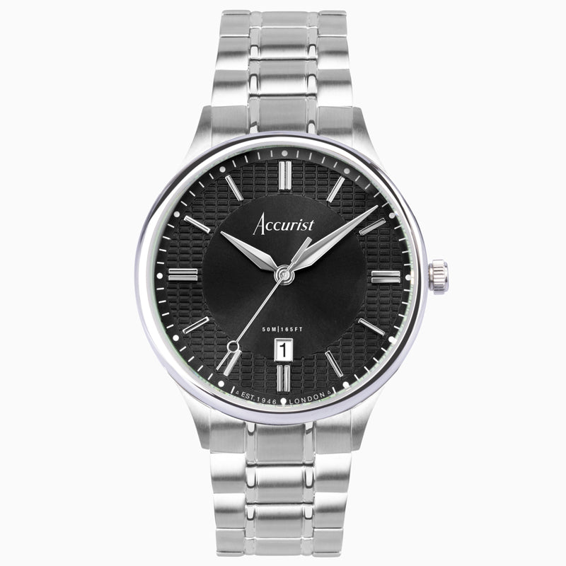 Analog watch with date display functionality, textured black face dial, silver dial hands and dial numerals, stainless steel band with a push deployment clasp. This watch has a water resistant mark of 50 meters (164 feet) which is suitable for showering with, made by Accurist, part of the Classic collection.