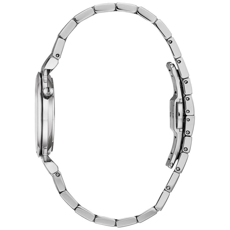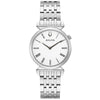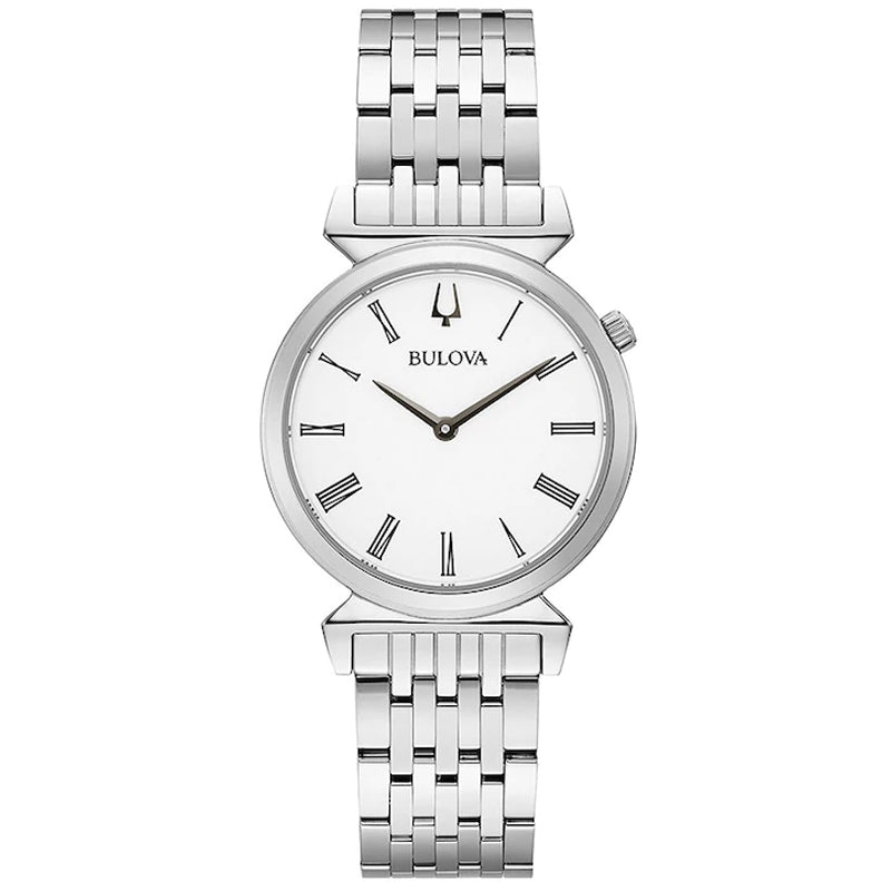 Analog watch with black dial hands & roman dial numerals, white dial face, and stainless steel band with push deployment clasp. This watch has a water resistant mark of 30 meters (98 feet) which can only take splashes, made by Bulova part of the Classic collection.