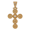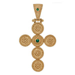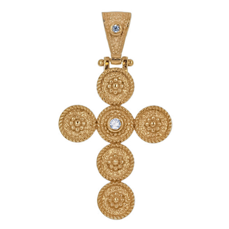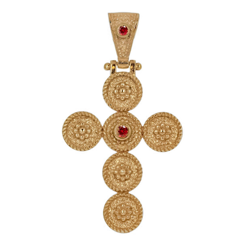 Fill inThe "Byzantine Solitaire Crucifix" pendant is inspired by the once great Byzantine Empire. Made from sterling silver with a gold plated coating and fitted with a solitaire round cut stone at its centre, part of the Byzantine Collection. description here.
