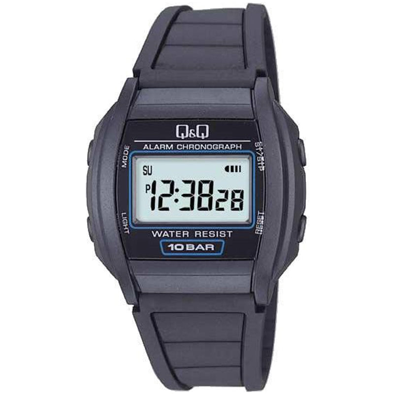 Digital watch with,stopwatch, alarm, automatic calendar and EL backlight functionalities, a black resing band with a stainless steel buckle clasp. This watch has a water resistant mark of 100 meters (328 feet) which is suitable for swimming with, made by Q&Q.
