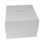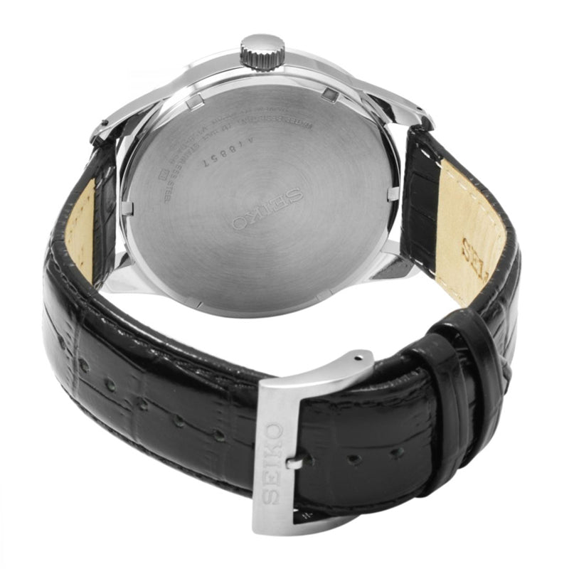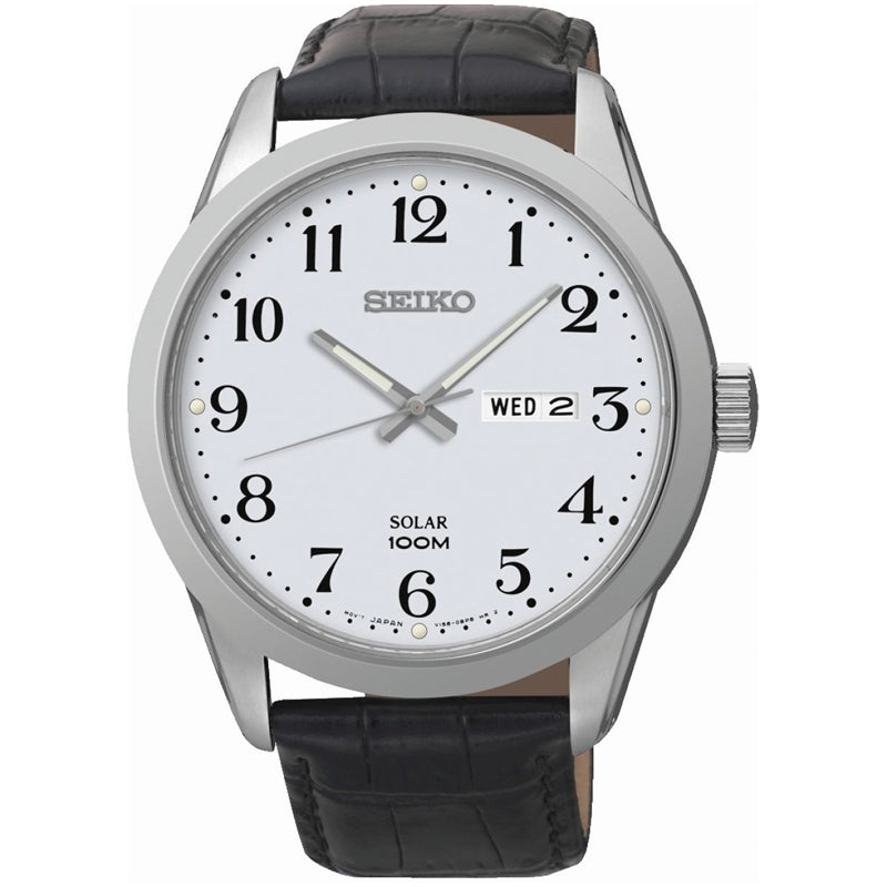 Solar powered watch with day & date display, white face dial, luminous silver dial hands & black dial numerals, black leather band with buckle clasp. This watch has a water resistant mark of 100 meters (328 feet) which is suitable for snorkeling with, made by Seiko.