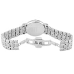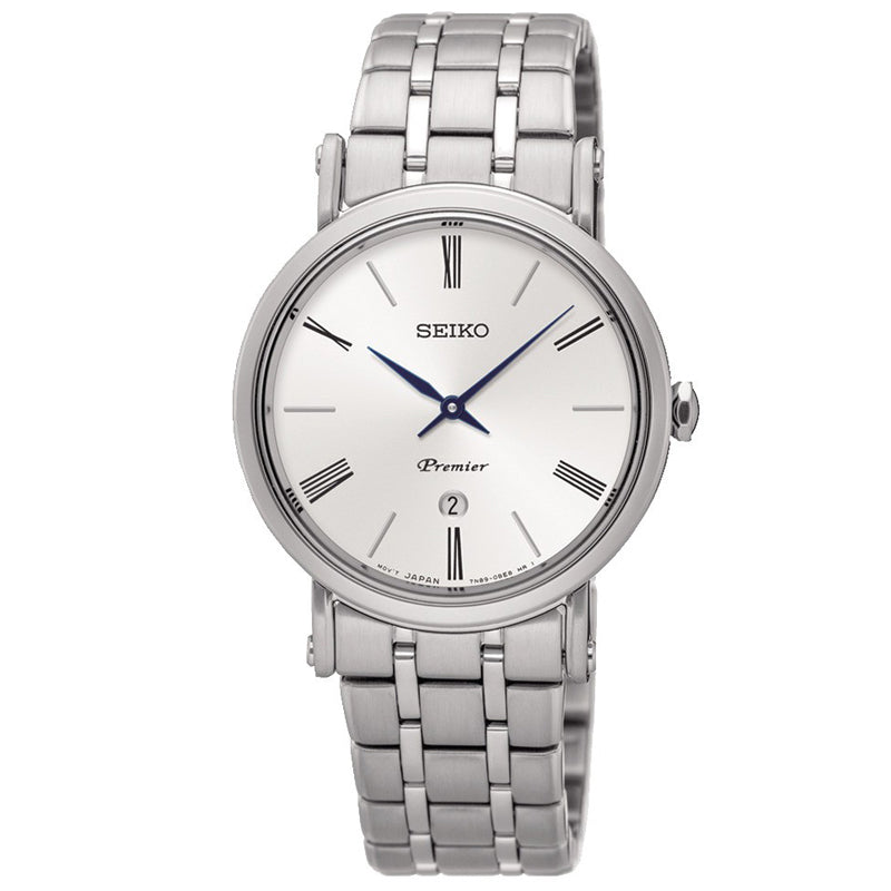 Analog watch with a silver coloured face dial, blue dial hands and silver dial roman numerals, stainless steel band with a push deployment clasp. This watch is water resistant and can only take splashes, made by Seiko.